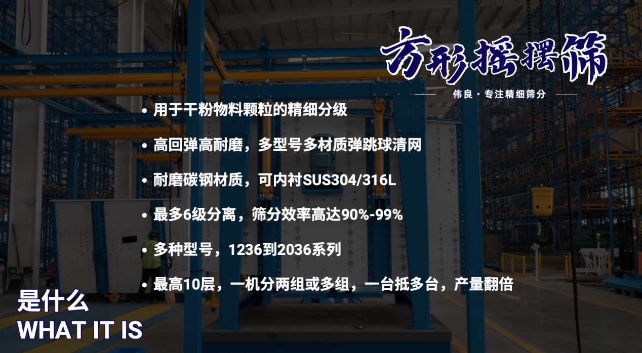 干粉砂漿生產(chǎn)工藝中關(guān)鍵是砂的處理以及混料的均勻性,特別是砂的篩分和烘干。其中,篩分的主要問題在于如何使砂的粒度級(jí)配合理,這都對(duì)生產(chǎn)設(shè)備提出了較高的要求,針對(duì)干粉砂漿我們專門設(shè)計(jì)了一款篩分設(shè)備就是我們的偉良方形搖擺篩。