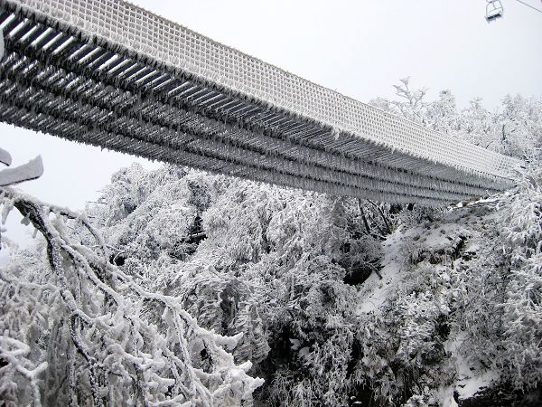 由于淡季,不用排隊(duì)很快坐上了索道,前前后后的轎廂內(nèi)都沒人,俺倆坐著好不優(yōu)哉。索道漸次翻越而后陡然爬升,進(jìn)入乳白色的氤氳之中,最后全被濃厚的霧氣包裹,像在云霧中漂移。俺又爽又驚,心想神仙還真不是好當(dāng)?shù)?。看著前面的操作說明:沒事,這個(gè)挺先進(jìn)的,碰到惡劣天氣會(huì)自動(dòng)停止運(yùn)行。話音剛落,它就停了,然后左右左右的晃啊晃啊。俺顫顫地問:怕嗎?他說:嗯……還,還成。俺喃喃地道:靠,俺可不想死呢……終于正襟危坐地熬過了那幾分鐘的晃悠,繼續(xù)上行后,霧氣淡了許多,這才看到索道支架和輪軌竟然都凍上厚厚的冰掛。心肝一顫:不是吧,這是到哪了啊?!