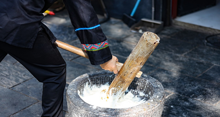 打糍粑:農(nóng)家過年時(shí),會(huì)用糯米蒸熟后捶打成糍粑,象征團(tuán)圓美滿,常蘸糖或包餡食用。