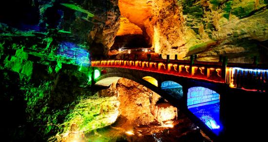 黃龍洞位于索溪峪東面,被稱為“地下魔宮”,洞口霧靄迷漫,洞內(nèi)長廊蜿蜒,鐘乳懸浮,石柱石筍林立,還有石簾、石幔、石花、石琴,琳瑯滿目,異彩紛呈,令人目不暇接?!岸赐舛础?、“樓外樓”、“天外天”、“山外山”,盤根錯節(jié)。黃龍洞內(nèi)可分四層,水陸并進(jìn),從最低陰河至最高穹頂,垂直高度差有100多米,洞內(nèi)有一個水庫(黃龍水洞)、二條陰河(響水河、水晶河)、三個地下瀑布(黃龍瀑、天水瀑、天地瀑)、四個水潭、十三個廳(宮)(龍舞宮、水晶宮、迷人宮……)、九十六條游廊,長度約達(dá)15公里,最大的廳堂有12000平方米,可容納萬人。真可謂是洞中乾坤大,地下有洞天。入黃龍洞,如入人間仙境一般。