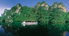 湖中有兩座疊翠小島,近岸奇峰屹立,峰回水轉(zhuǎn)。泛舟漫游,只見(jiàn)一湖綠水半湖倒影,充滿詩(shī)情畫(huà)意?!霸铺萑f(wàn)丈上天臺(tái),高峽平湖一鑒開(kāi),王母瑤池金扶,浣沙仙女下凡來(lái)”游寶峰湖,你就會(huì)欣賞到這樣的詩(shī)情畫(huà)意。群峰擁抱的寶峰湖,長(zhǎng)約2.,5公里,湖猶如一面寶鏡,四面青山,一泓碧水,蕩槳溫游,格外愜意。坐在船上,環(huán)顧四周,千山聳翠,俯視水中,倒影慢移,碧水照相館得群峰綠,人面桃花水映紅。真是靜極了,美極了!