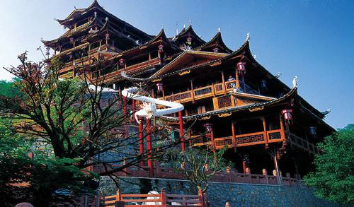 九重天世襲堂是土家風情園的精華和靈魂所在。該建筑由土家民間藝人李宏進設(shè)計,依80度陡坡而建,高48米,共9重12層,整個樓房全部用木栓連接,沒有一顆鐵釘,堪稱土家族建筑史上的奇跡。2002年9 月22日,九重天吊腳樓被載入世界吉尼斯世界紀錄,認定其為目前中國最大、最高、最完美的木質(zhì)結(jié) 土家風情園構(gòu)吊腳樓。