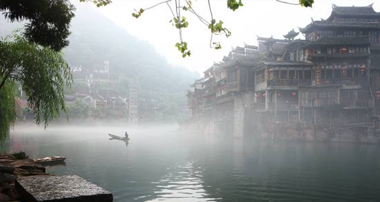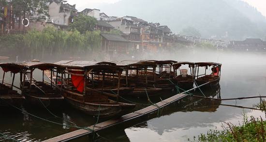 沱江河是古城鳳凰的母親河,她依著城墻緩緩流淌,世世代代哺育著古城兒女。坐上烏蓬船,聽著艄公的號子,看著兩岸已有百年歷史的土家吊腳樓,別有一番韻味。順?biāo)?,穿過虹橋一幅江南水鄉(xiāng)的畫卷便展現(xiàn)于眼前:萬壽宮、萬名塔、奪翠樓……一種遠離塵世的感覺悠然而生。沱江的南岸是古城墻,用紫紅沙石砌成,典雅不失雄偉。城墻有東、北兩座城樓,久經(jīng)滄桑,依然壯觀。 沱江河水清澈,城墻邊的河道很淺,水流悠游緩和,可以看到柔波里招搖的水草,可以撐一支長篙漫溯。沿沱江邊而建的吊腳樓群在東門虹橋和北門跳巖附近,細腳伶仃的立在沱江里,象一幅永不回來的風(fēng)景。